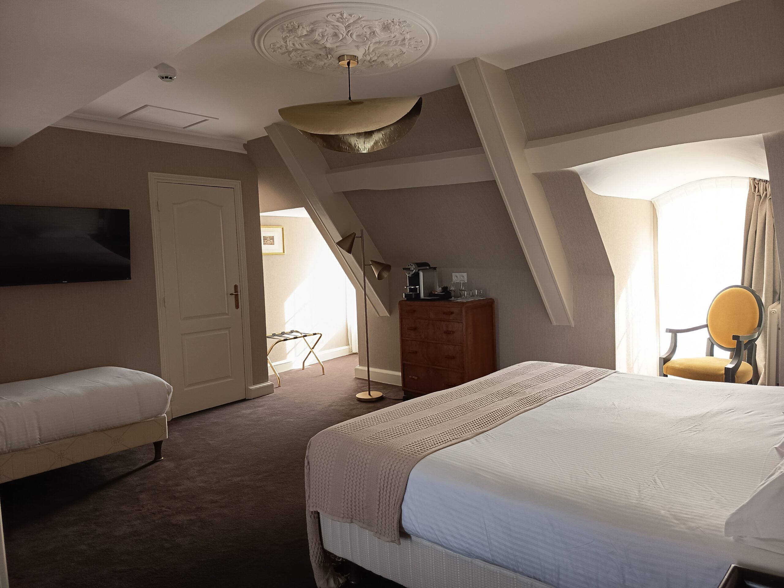 Zimmer für 3 Personen, ausgestattet mit einem 180*190 cm und einem 90*190 cm großen Bett, Flachbildfernseher, Satellitenempfang, kostenlosem WiFi, Minibar, kostenlosem Nespresso-Kaffeeservice, Safe, eigenem Bad und WC, Haartrockner, Vergrößerungsspiegel, Bademantel und Hausschuhen.